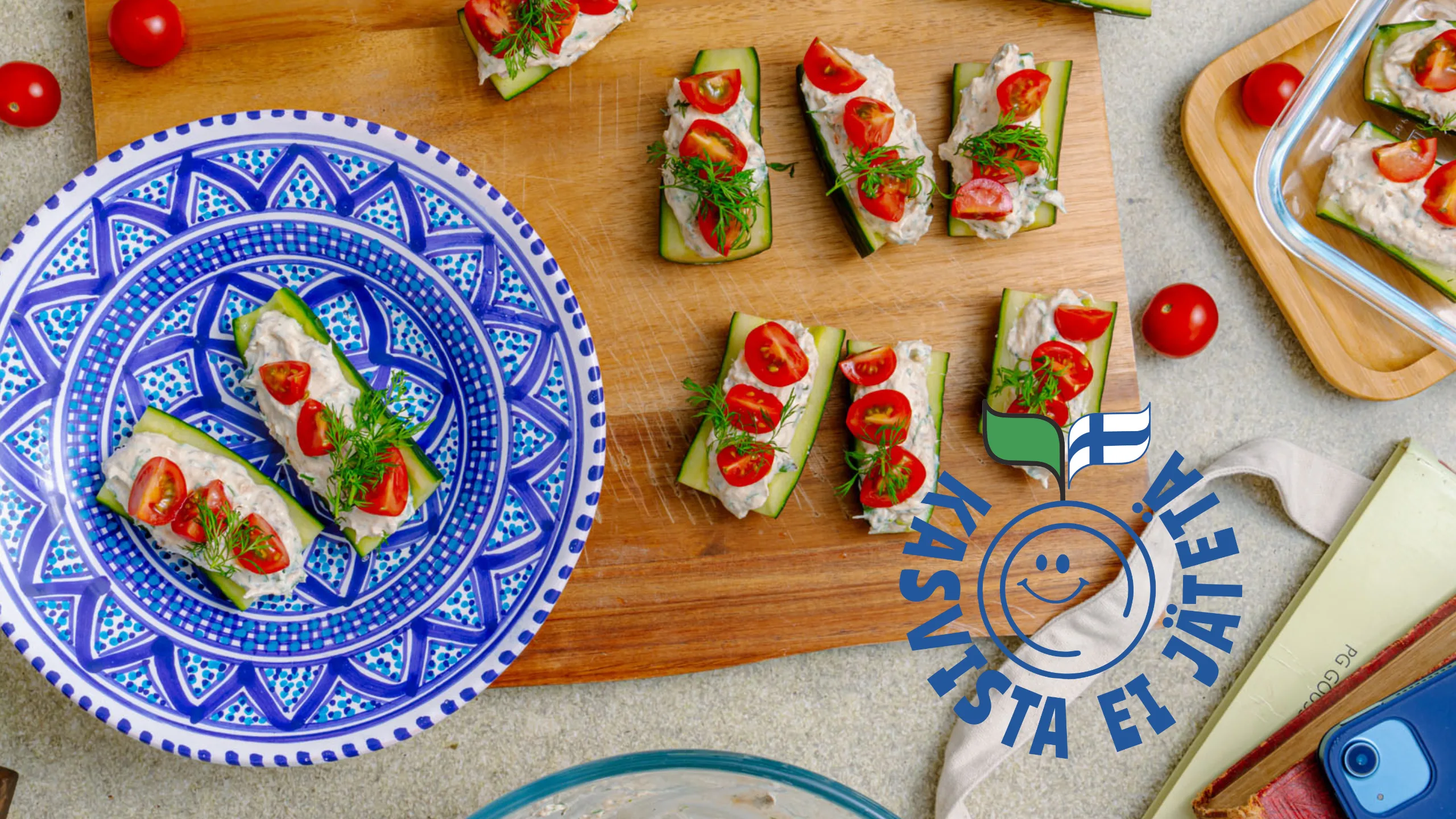 Nämä hauskat naposteltavat syntyvät helposti vaikkapa kaverisynttäreille tai yökyläillessä. Kotimainen järvikalatäyte tekee annoksesta ruokaisan. Reseptillä syntyy noin 15 kurkkuvenettä.
