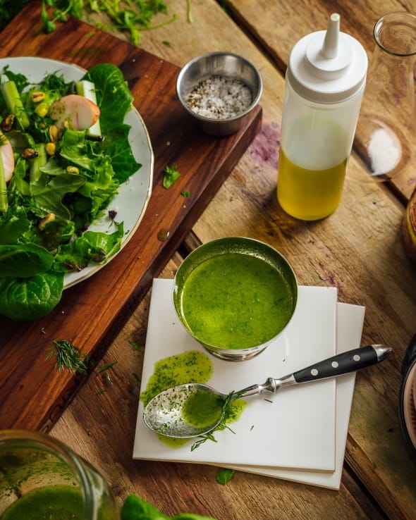 Yrteillä maustettu vinegretti tuo makua ja väriä salaatteihin ja vihanneksiin.