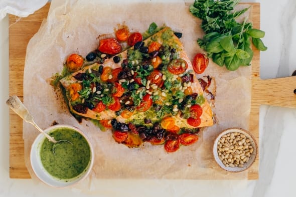 Pääruokana välimeren lohta ja paprikacrostineja
