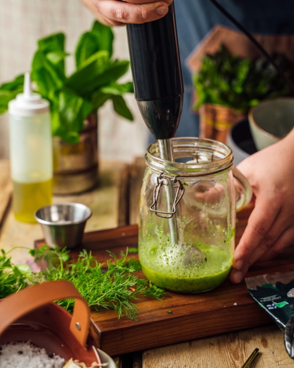 Itse tehty kastike syntyy hyvästä öljystä, muutamasta eri tuoreyrtistä ja ripauksesta etikkaa. Yrtit tuovat kastikkeelle paitsi mahtavan maun, myös upean vihreän värin. Pehmeävartisista yrteistä kannattaa ehdottomasti hyödyntää myös varret.