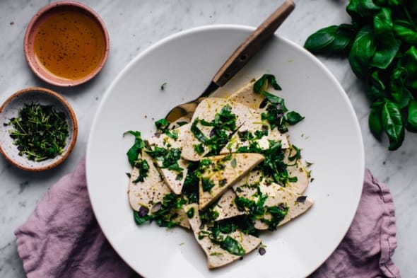 Kasvissyöjät ilahtuvat tofusta, jossa on runsaasti makua. Raikkaan yrttinen marinadi kannattaa valmistaa viimeistään tuntia ennen tofun kypsennystä.