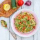 Sekoita kaikki hienonnetut ja kuutioidut raaka-aineet kulhossa, lisää sekaan öljy ja hyppysellinen suolaa sekä pippuria. Sekoita kevyesti.